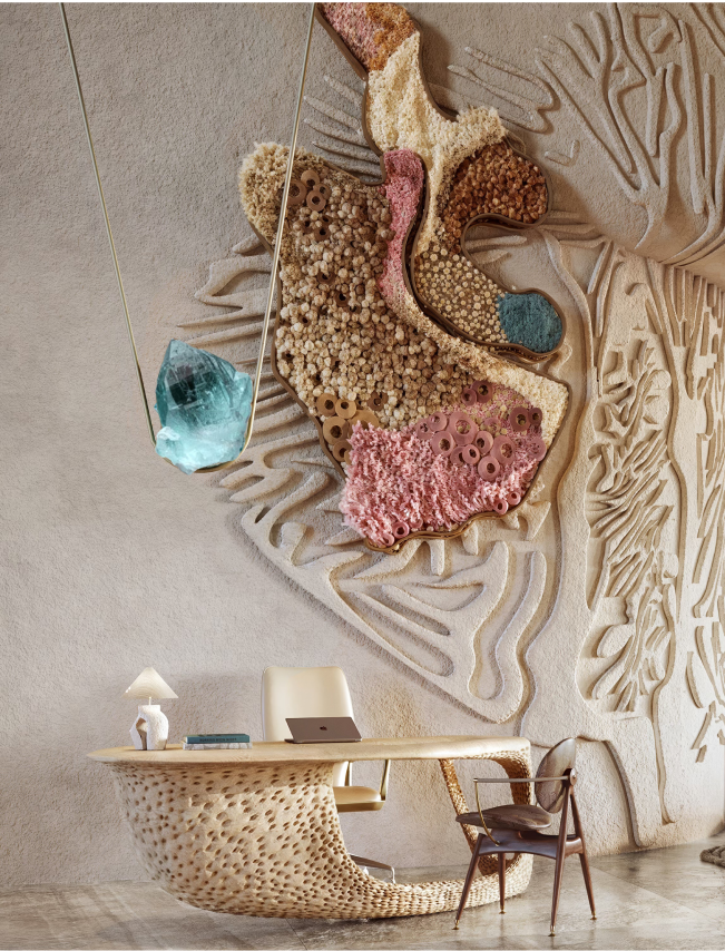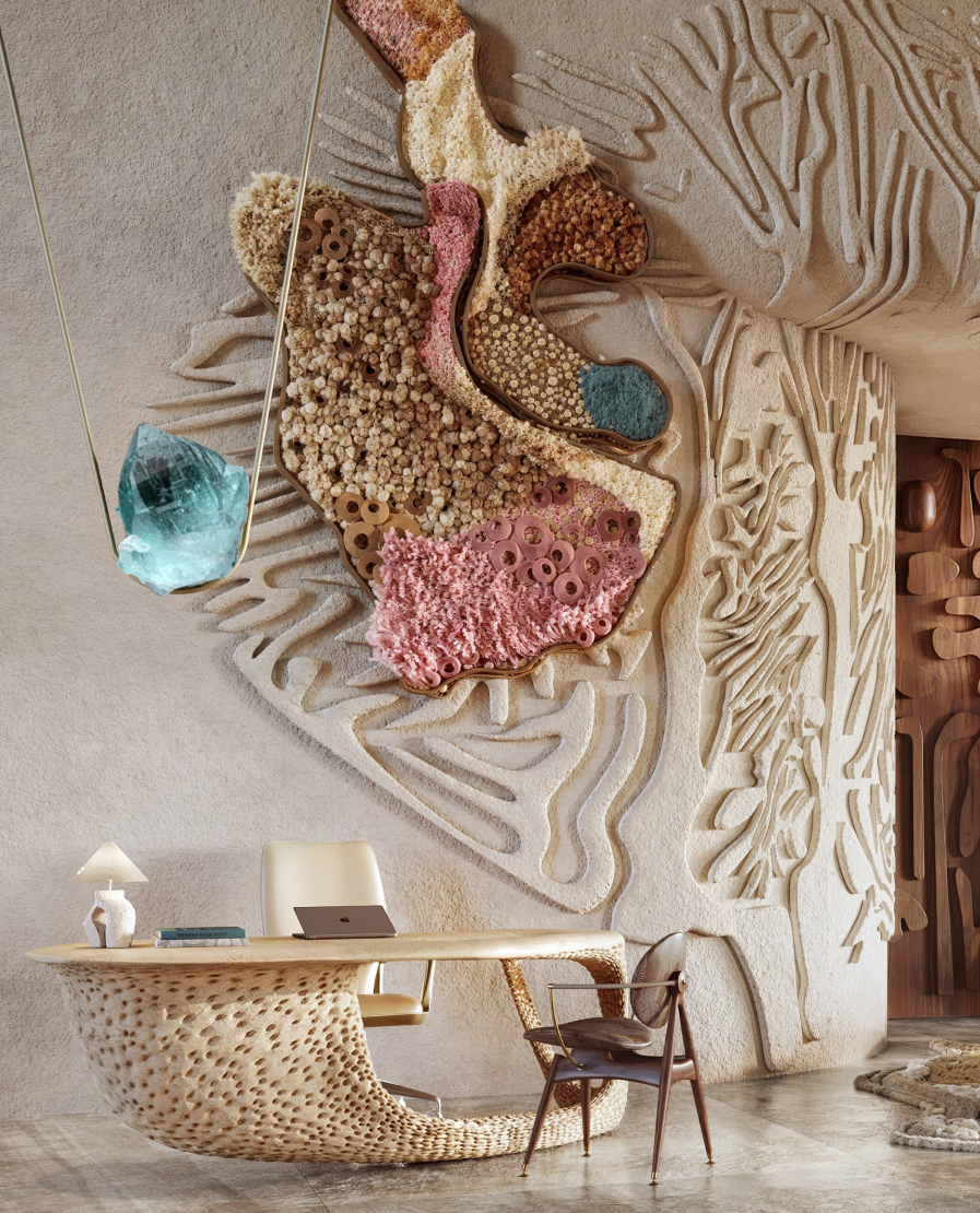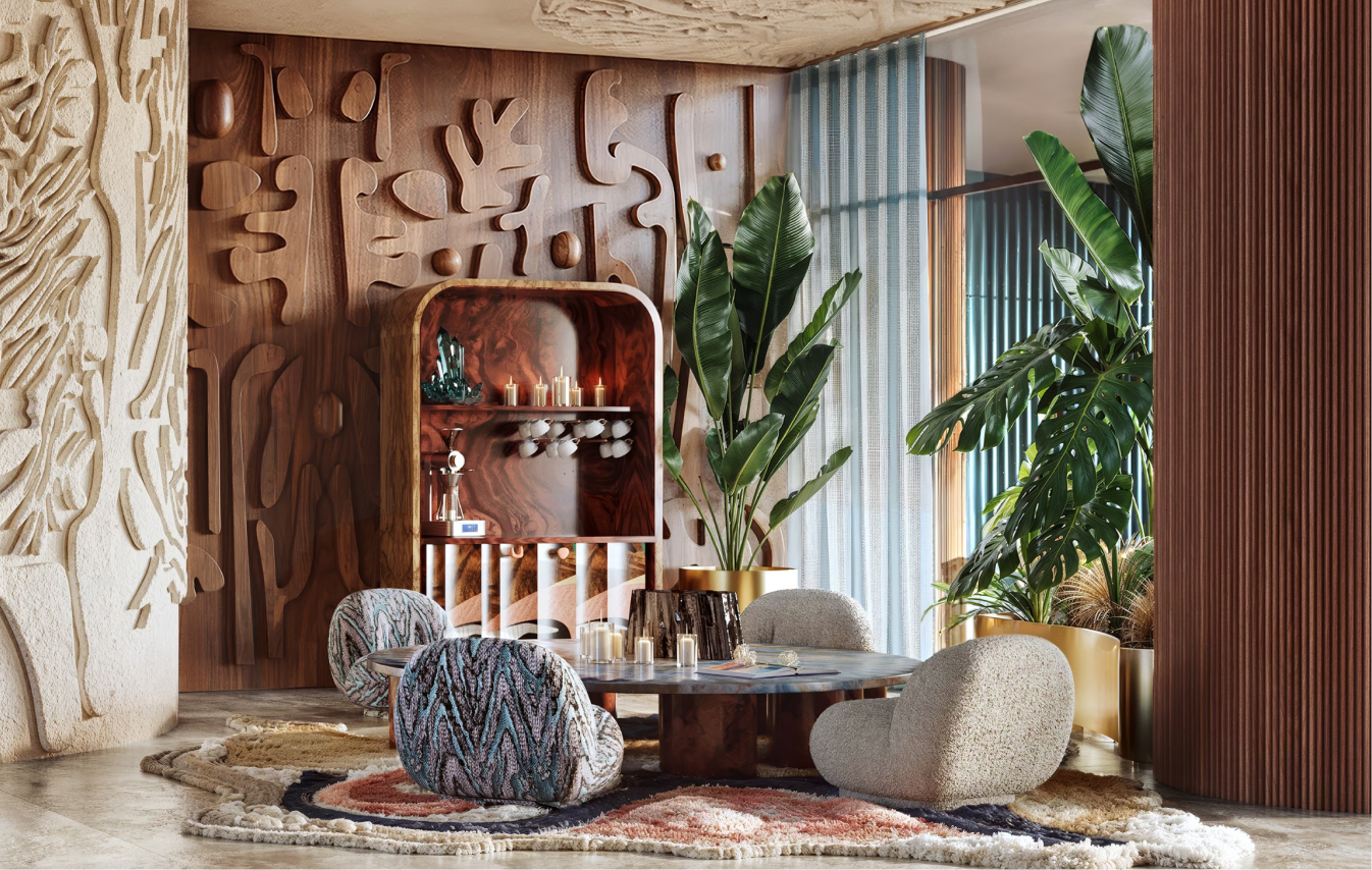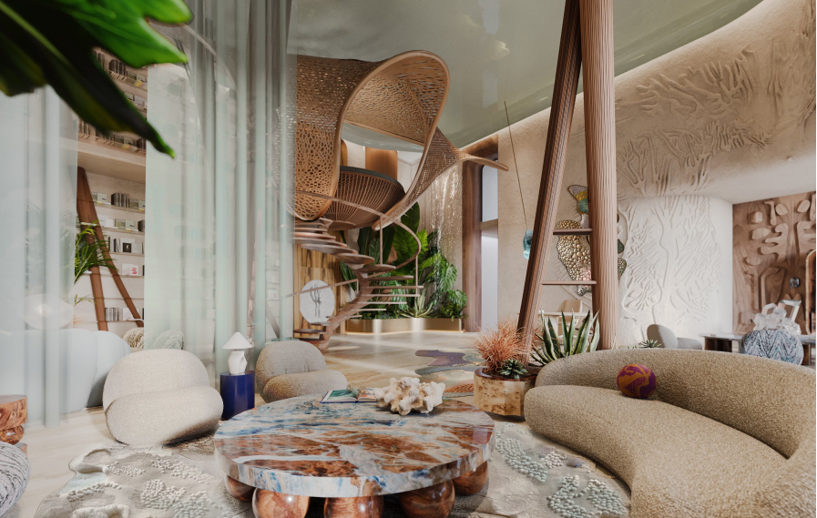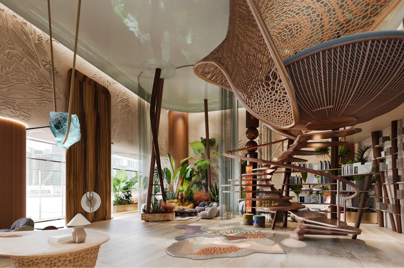 Eywa is a luxury residential building based in Dubai, UAE that aims to redefine current way of urban lifestyle. By relocating focus from minimalistic and angular perfection to natural forms, shapes and textures, the building connects to people on an instinctual level, creating a calming and grounding environment rooted in a lifestyle of wellness and comfort. Inspired by coral reefs and mangrove forests of the UAE, Eywa too is a living organism, a biophilic building that interacts with its guests on all levels. Every detail is designed to offer an immersive sensory experience, from visually pleasing surfaces to signature aromas. The interior is characterized by wavy, organic forms, layered textures and natural, luxurious materials, drawing on the main theme of the building - The Way of Water