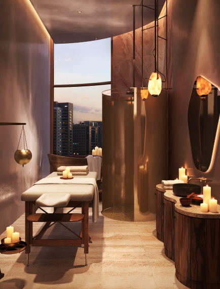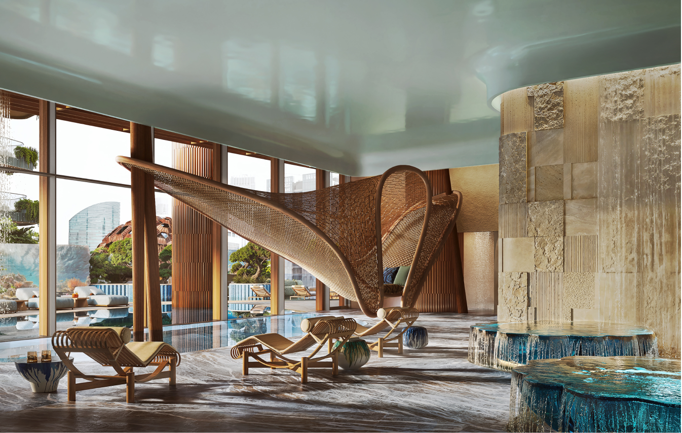 Interior draws inspiration from regional water habitats, with coral and mangrove motifs introduced throughout common and private spaces. Reflective ceilings in the amenities area and private residences represent the ocean surface, while the lobby features wall patterns, color schemes and bespoke furniture guided by shapes and forms of the underwater world.