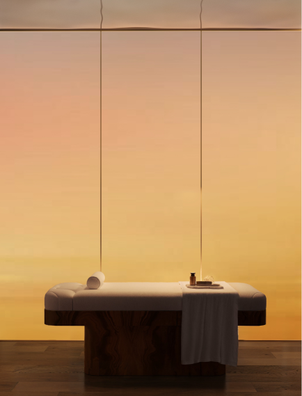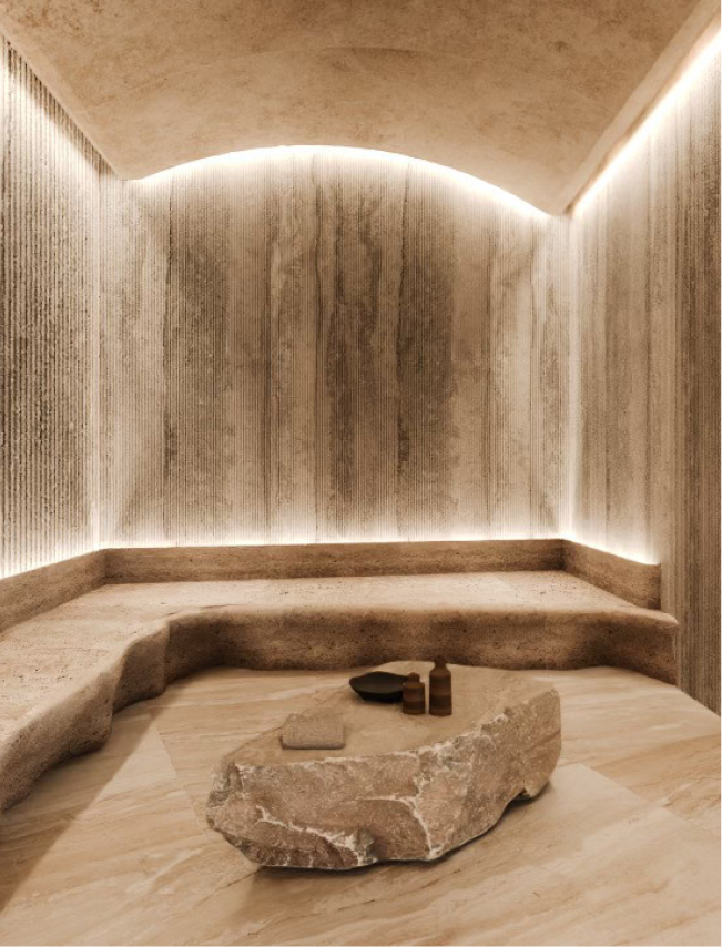 Integrated audio system fills public spaces with nature sounds, with designated music listening spots in the lobby and spa. Bespoke fragrance curated for Eywa is integrated into the ventilation system, and tea ceremonies await guests in the amenities area. Tactile sensory experiences are delivered through use of different materials and textures - smooth brass surfaces contrasted with rough-carved wood interior items, layered rugs soft to touch compliment rough-cut stone sinks.