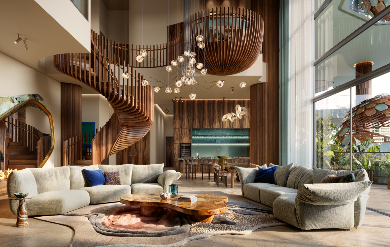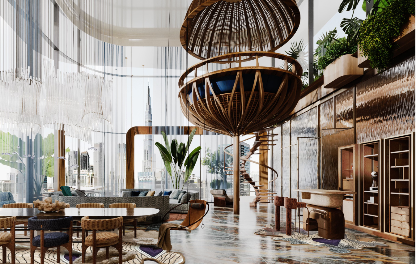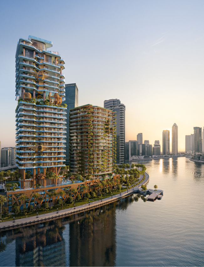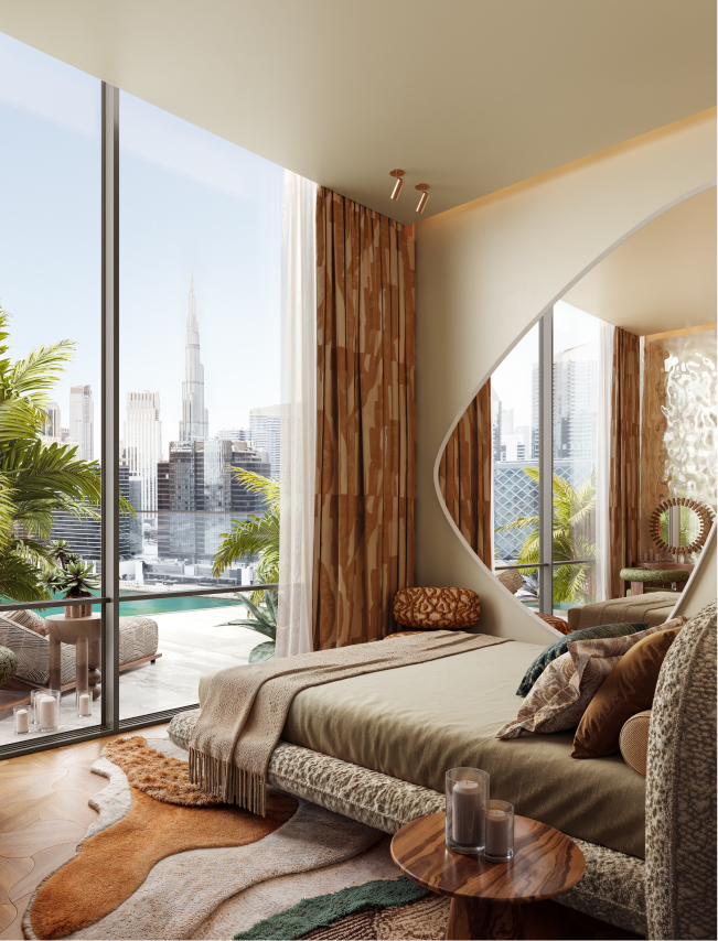 Orientation of the tower maximizes panoramic views, natural daylight, and privacy, ensuring that every residence enjoys expansive perspectives - including views toward Burj Khalifa - while simultaneously optimizing environmental performance and reinforcing a cohesive architectural narrative that merges wild organic forms with refined modern living.
