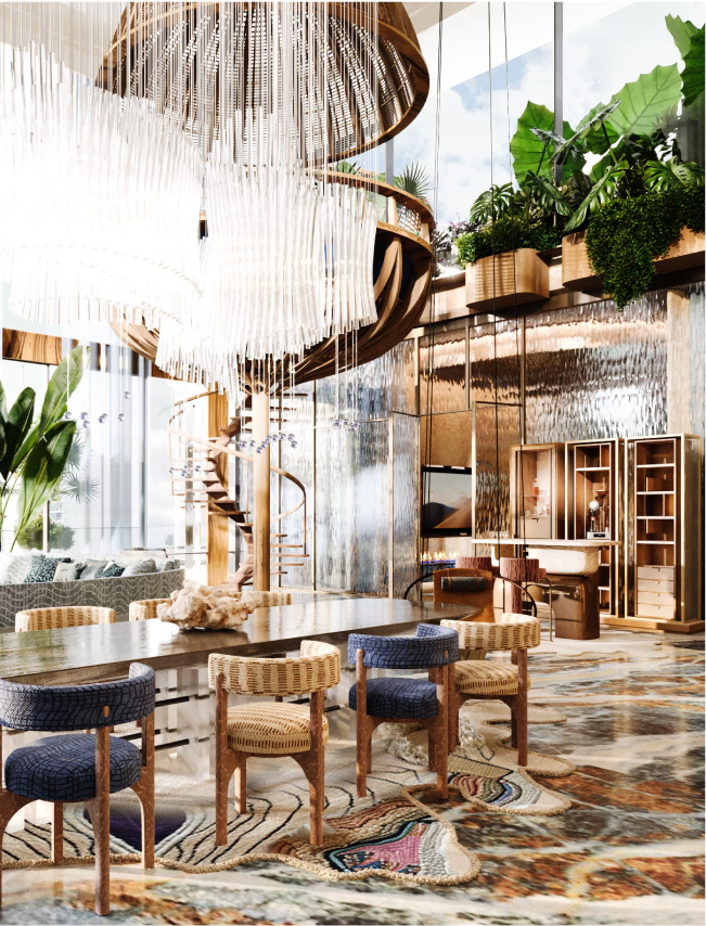 Central to the project is the concept of ‘wild luxury’ - the raw beauty of nature combined with bespoke, handcrafted design and sensory experiences for a lifestyle of wellness and well-being. Eywa’s concept of wild luxury helps us enhance human relationships and experiences by making spaces feel alive and engaging. Well-being is supported through use of natural light, plants, and organic materials, nature-inspired audio systems, wellness amenities, such as SPA, meditation room, sauna, and water and fire features - waterfalls, fireplaces, rain showers.