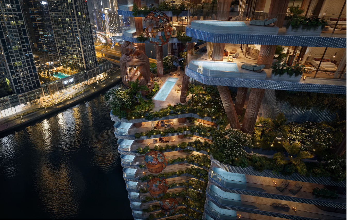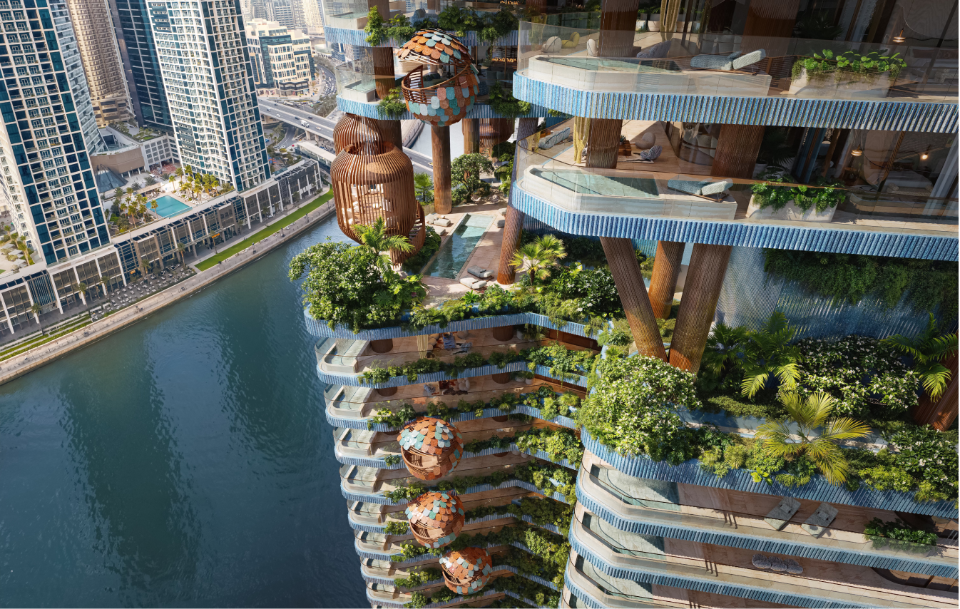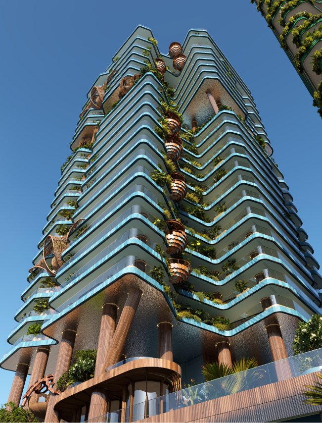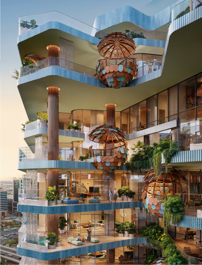 The structural columns are not hidden technical elements but expressive features that shape the building’s identity, forming nest - like balconies that represent family sanctuaries within the greater whole, while the combination of earthy terracotta cladding and contemporary glass surfaces creates a tactile contrast between warmth and transparency, reinforcing the project’s nature - centered aesthetic and establishing a strong visual presence in Business Bay.