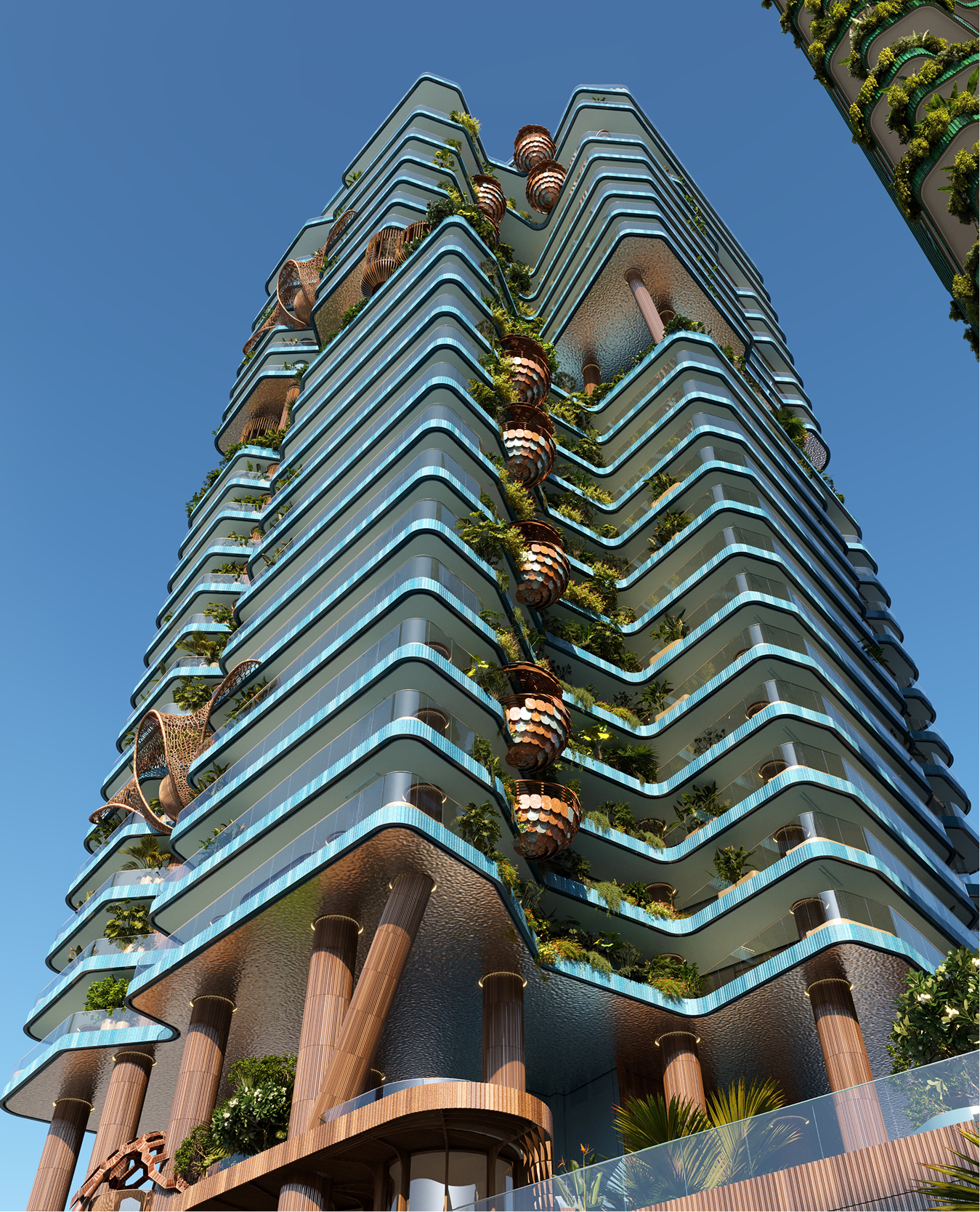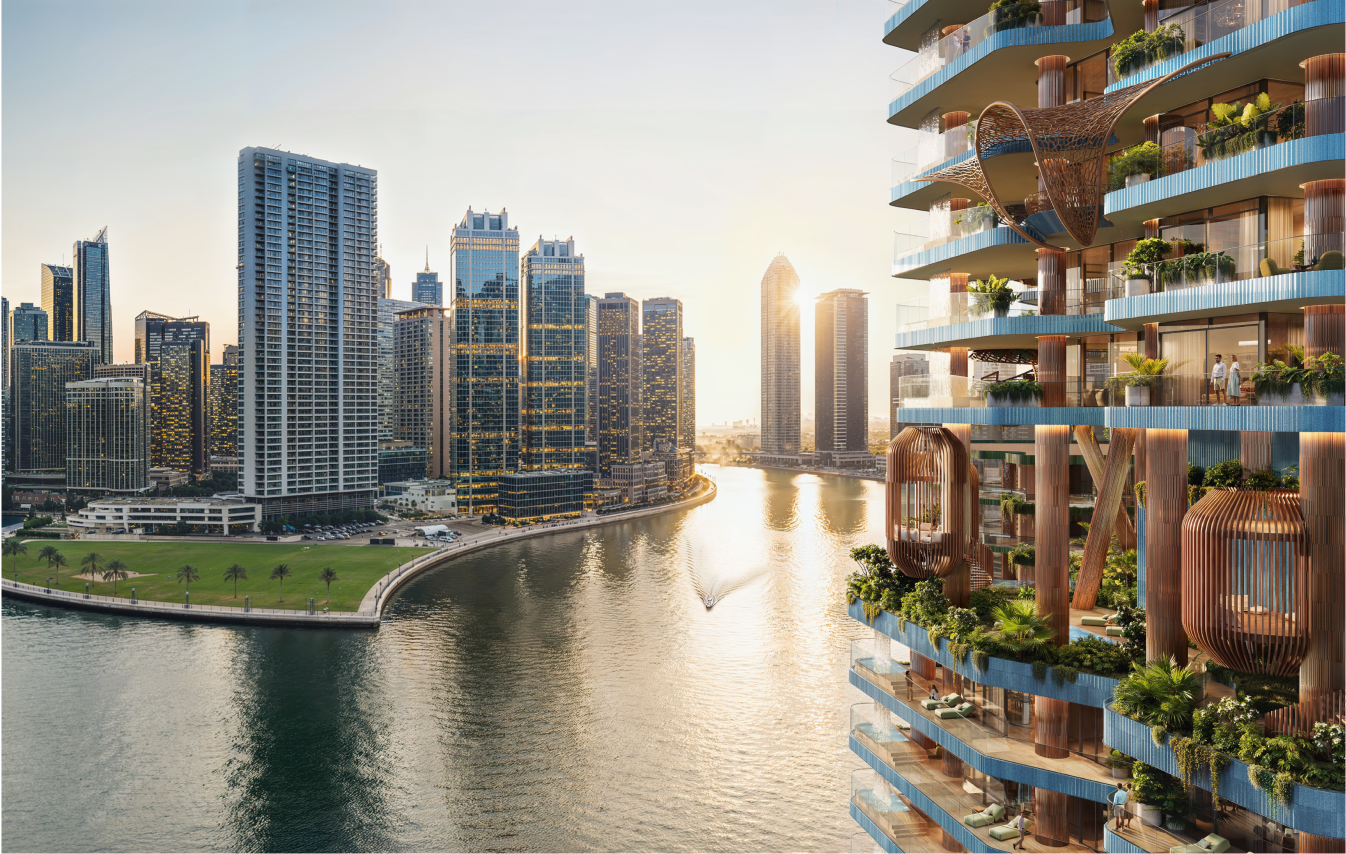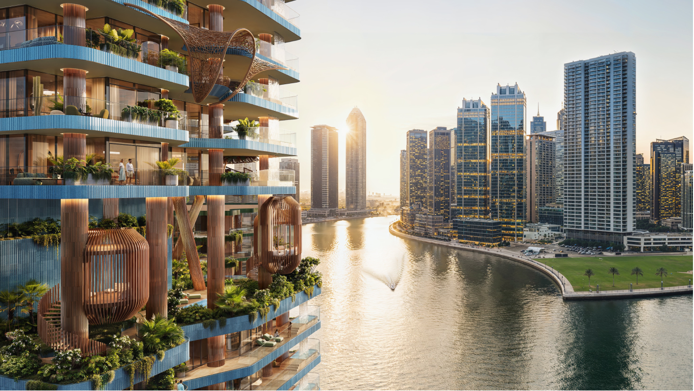 The structural columns are not hidden technical elements but expressive features that shape the building’s identity, forming nest - like balconies that represent family sanctuaries within the greater whole, while the combination of earthy terracotta cladding and contemporary glass surfaces creates a tactile contrast between warmth and transparency, reinforcing the project’s nature - centered aesthetic and establishing a strong visual presence in Business Bay.