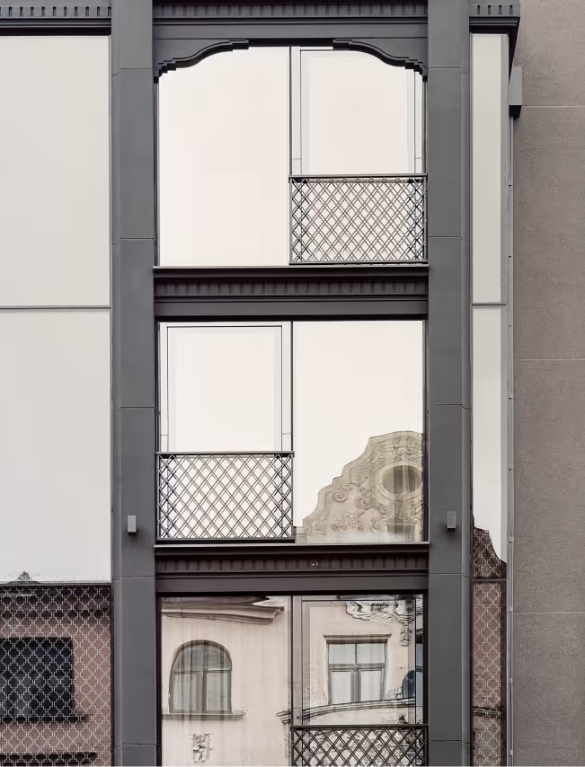 In the golden glow of autumn evenings, the building’s striking façade comes to life, designed to echo the dynamic aesthetic of Baznīcas Street. It engages in a subtle visual dialogue with its surroundings: the nearby St. Gertrude Church, ornate Art Nouveau architecture, and the emerging eclectic developments. The design pays special attention to the building’s proud centrepiece - the bay window - interpreted here as a reflective, dark monochrome volume that draws attention through texture and pattern. A bold yet harmonious statement within the evolving cityscape.